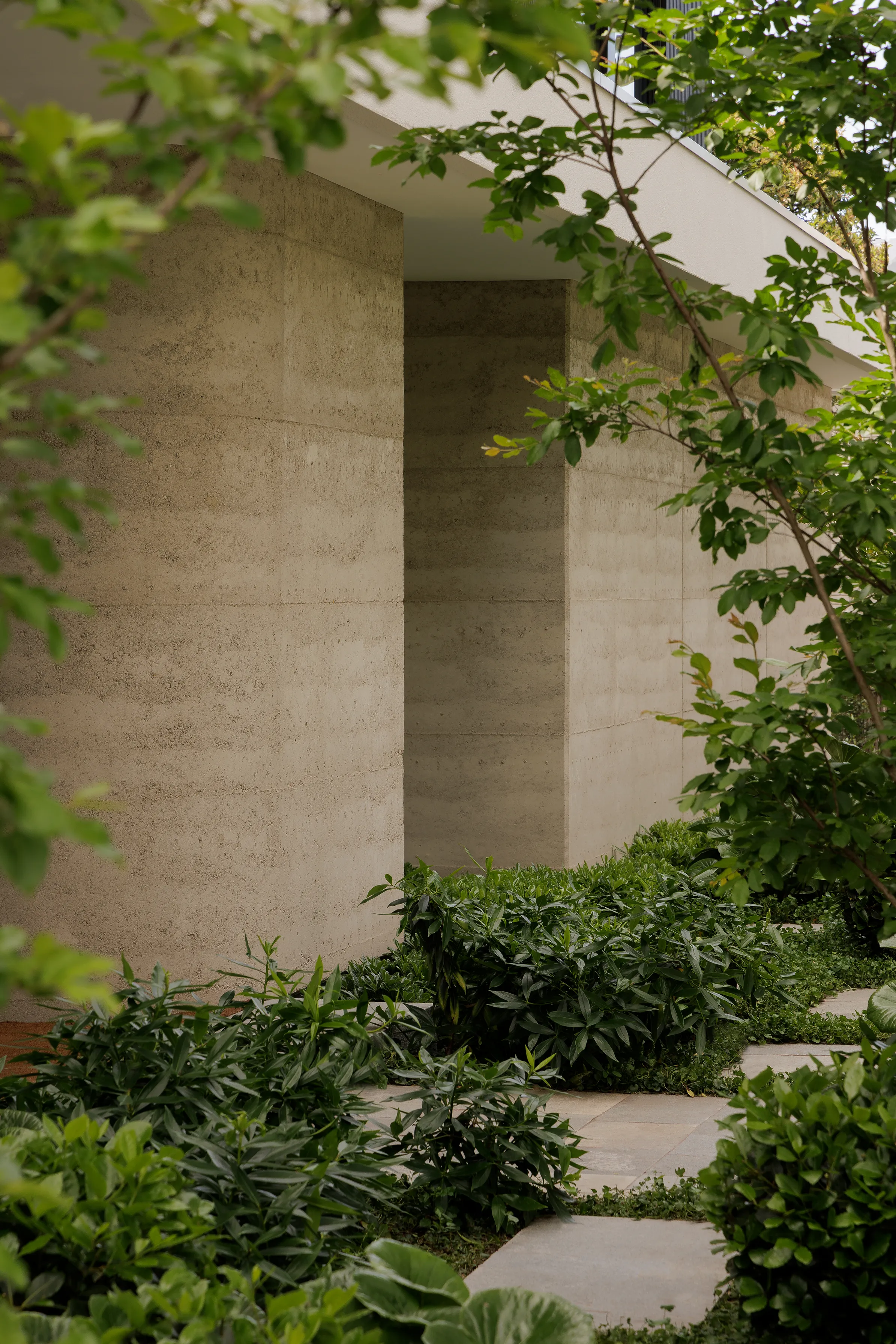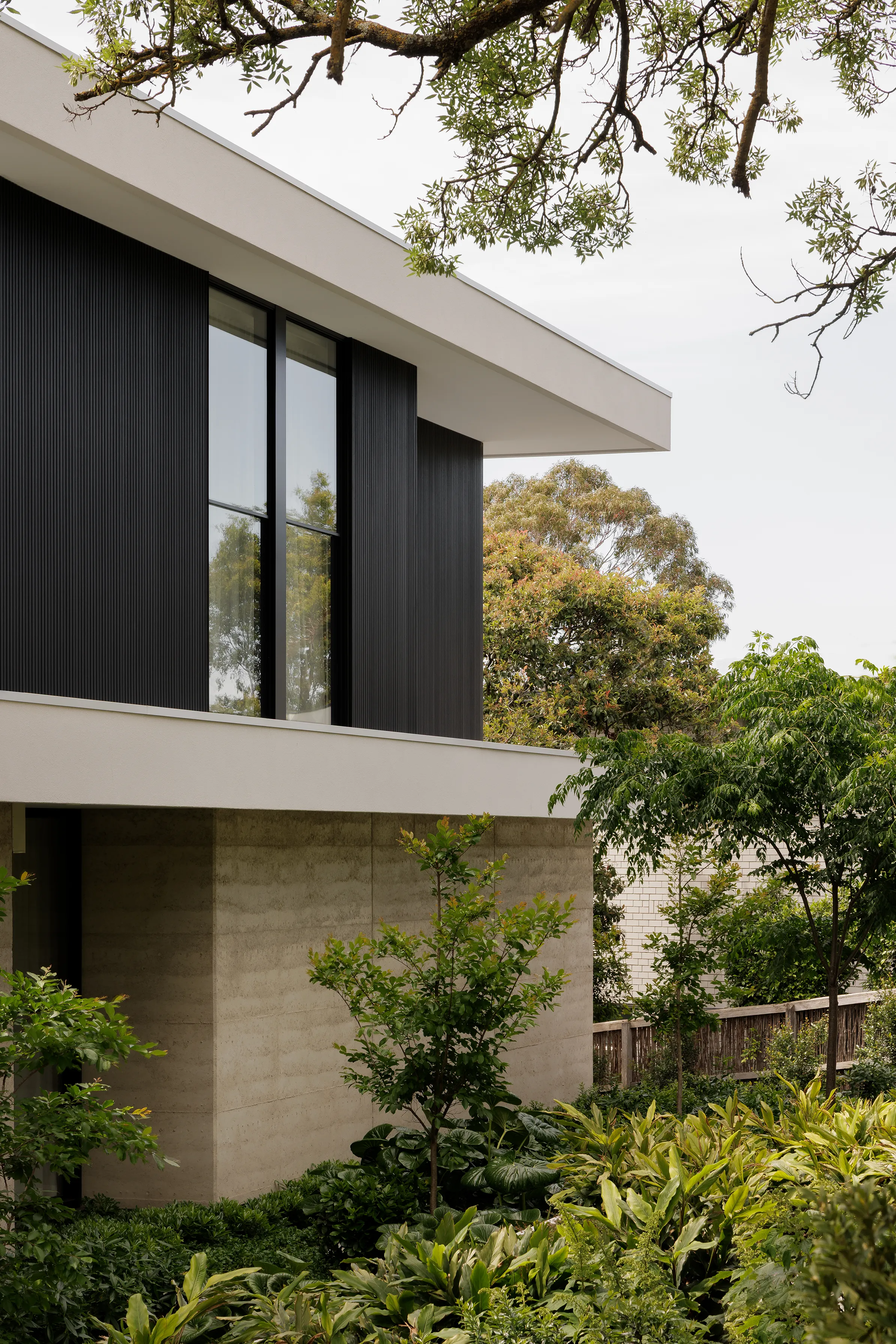 At the street, a permeable metal palisade fence dissolves the boundary between nature strip and front garden. Staggered limestone stepping stones meander through low plantings of Dichondra repens, Sweet Daphne, Japanese Viburnum and Dwarf Pittosporum, underneath a canopy of Crepe Myrtles. The lush vegetation softens and complements the monolithic rammed-earth facade.