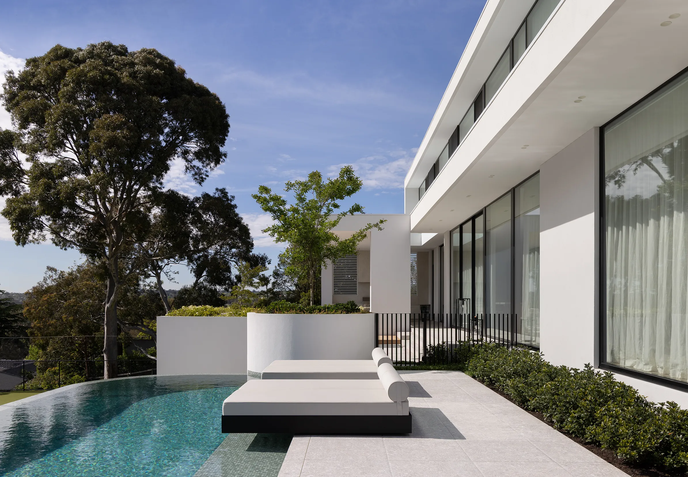 Beyond a clean horizontal built composition, a grand external staircase navigates the dramatic level change between the pool terrace and the tennis court, anchored by a cylindrical tree planter that doubles as a pool barrier. The infinity-edge pool, clad in soft green Bisazza ‘Delhi’ glass tiles, merges with borrowed views of distant tree canopy while minimising fencing.